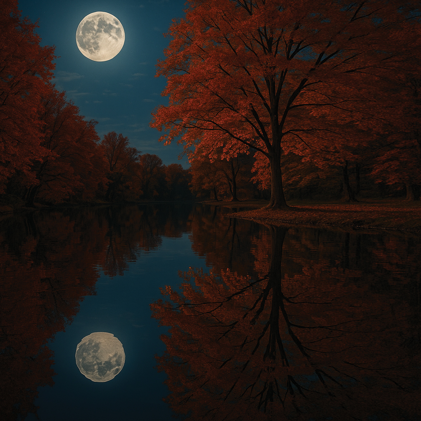 The moon rose clean and bright, a coin set carefully on the lake. The trees bowed toward it, their copper leaves whispering as if they knew a password I did not. I followed the narrow dock until wood met water and the night took my reflection in.